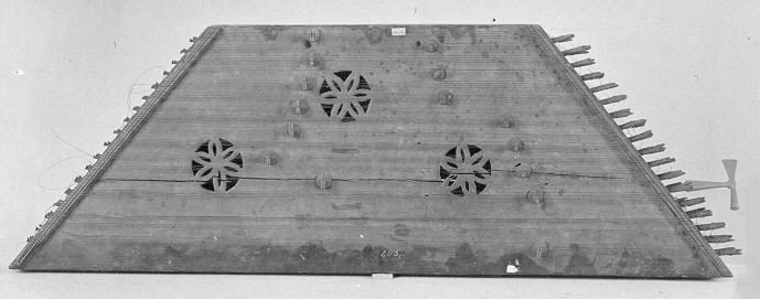 بریده ای از تصویر بزرگ تر و اشاره به زن سنتورنواز در عمارت هشت بهشت اصفهان به تاریخ 1669 ( این سنتور 8 دسته سیم دوتایی دارد و با مضراب های بسیار بلند نواخته میشود و همچنین به دلیل مشبک بودن صفحه ی رویی گلی جداگانه روی آن تعبیه نشده است. همچنین خرکی در این سنتور دیده نمیشود.)